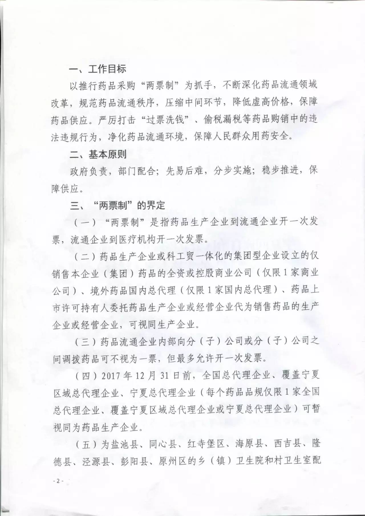 医疗机构索要的“两票”指药品生产企业或视同为生产企业的经营企业(代理商)开具给流通企业的一次购销发票(第一票),以及流通企业开具给医疗机构的一次购销发票(第二票)。如存在政策允许的内部一次调拨或(和)乡镇卫生院根据实际情况增加一票,调拨或(和)增加的一票所产生的购销发票视为政策允许的一次购销发票(第三票),符合我区“两票制”试行规定。